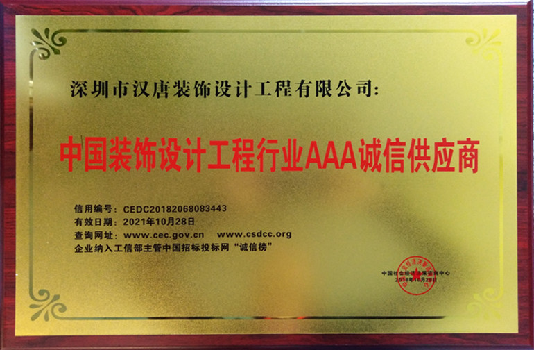2018年10月28日,中国社会经济决策咨询中心对深圳市立博中国的信用状况进行了评价,结果为AAA级,颁发了“中国装饰设计工程行业AAA诚信供应商”“中国装饰设计工程行业质量信用AAA企业”证书,同时汉唐建设被纳入工信部主管中国招标投标网“诚信榜”。