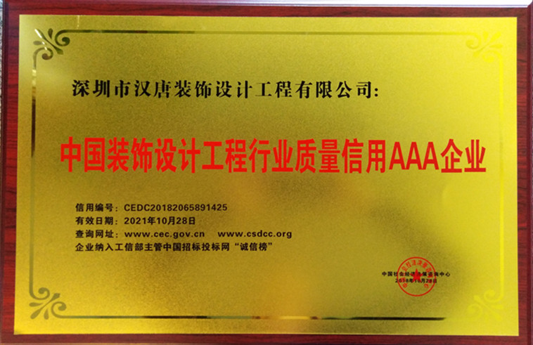 本次几大权威机构对汉唐建设授予名优企业、质量信用AAA企业等称号,源于汉唐建设集团十五年如一日对“成就客户,进取创新,务实守信,多元共赢”的企业价值观的坚守;源于汉唐人对“信用”一词的踏实践行;源于3000+企业客户项目的顺利交付以及客户朋友的认可赞许;源于中国中小企业协会的大力支持;汉唐建设正凭借着强大的设计能力、全产业链整合服务能力、工程交付能力以及售后服务能力,发展成为中国装饰行业信用榜样企业!