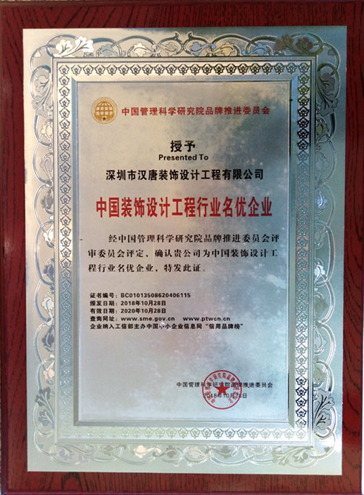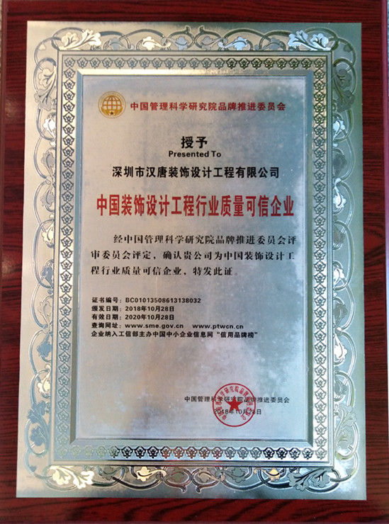 同一天,中国管理科学研究院品牌推进委员会对汉唐建设集团进行了质量信用评审,确认汉唐建设为行业可信企业,颁发了“中国装饰设计工程行业质量可信企业”和“中国装饰设计工程行业名优企业”证书,同时汉唐建设被纳入工信部主办中国中小企业信息网“信用品牌榜”。