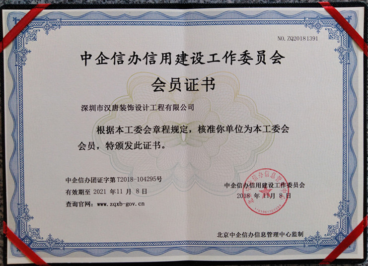 2018年11月8日,北京中企信办信息管理中心对汉唐建设集团进行资质审核,结果通过,批准且颁发了“中企信办信用建设工作委员会会员证书”。