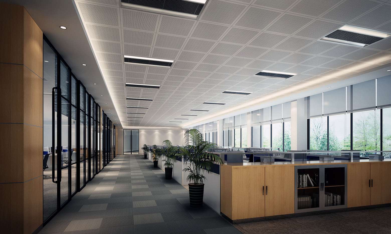 室内界面通常是由六个界面构成,其中比较主要的是地面、墙面和顶面三个。为了取得比较好的办公空间效果,需将墙面的空间形状、色彩及质感等方面进行处理,横向的线条或纹理在空间内呈水平延伸,可使人感到安定,而纵向的线条或纹理则能使空间更显高耸,易给人以兴奋感,因此,低矮的办公空间可选用纵向纹理来增加空间的视觉高度,窄小的空间可选用横向线条来进行装饰。同时在进行界面处理的时候还需要注意背景陪衬、风格气氛的协调,常用处理手法包括形体与过渡、质感与光感的调整等。