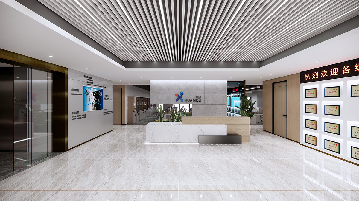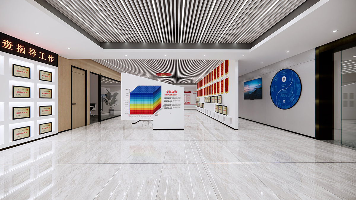接待台位于空间中心,方便接待访客。背景墙展示企业标志,强化品牌印象。左侧展示区介绍企业发展历程与业务,右侧荣誉墙展示企业荣誉。
