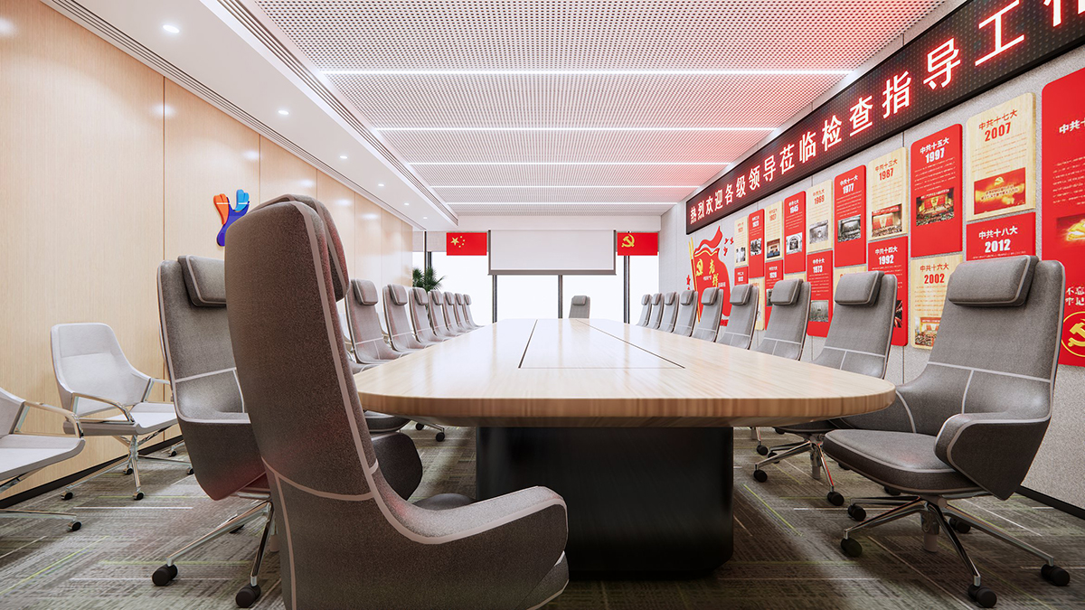 地面铺地毯,减少脚步声干扰。墙面采用吸音材料,提升声学效果。天花板的格栅吊顶搭配嵌入式灯具,营造简洁大气的空间感。整体色彩以中性色为主,营造沉稳专业氛围。
