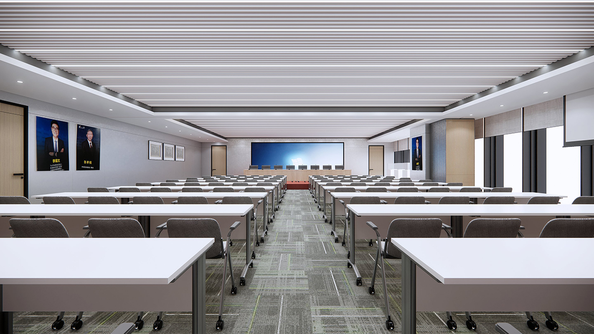 桌椅排列规整,方便参会人员就座与观看演示内容。前方设置大屏幕,满足会议展示需求。两侧墙面悬挂企业重要人物照片与荣誉证书,彰显企业实力与文化。