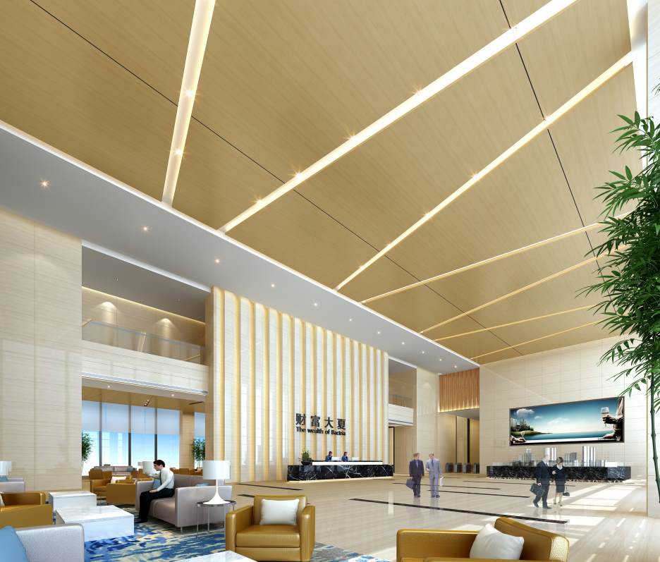 设计说明:邢台财富大厦项目是由河北乾康房地产开发有限公司投资兴建的集商务办公、商业、餐饮、休闲娱乐于一体的大型城市综合体。邢台财富大厦项目定位为甲级5A写字楼,建成后将成为邢台市地标工程。室内装饰风格以深圳京基100装饰风格为主,以浅色调为主,装饰手法庄重而不呆板、简约而不简单、中庸而不庸俗。设计从建筑的造型上提炼一些特征,形成建筑与室内的联系并做演化将建筑、艺术、环保有机结合。设计通过对建筑幕墙的横竖向线条进行演化,并运用到室内装饰上,且贯穿到不同的功能区域,这样自然而然地将建筑和室内空间联系在一起。由重复产生的韵律感和统一性,也是生成空间隐重大气的重要设计手法。