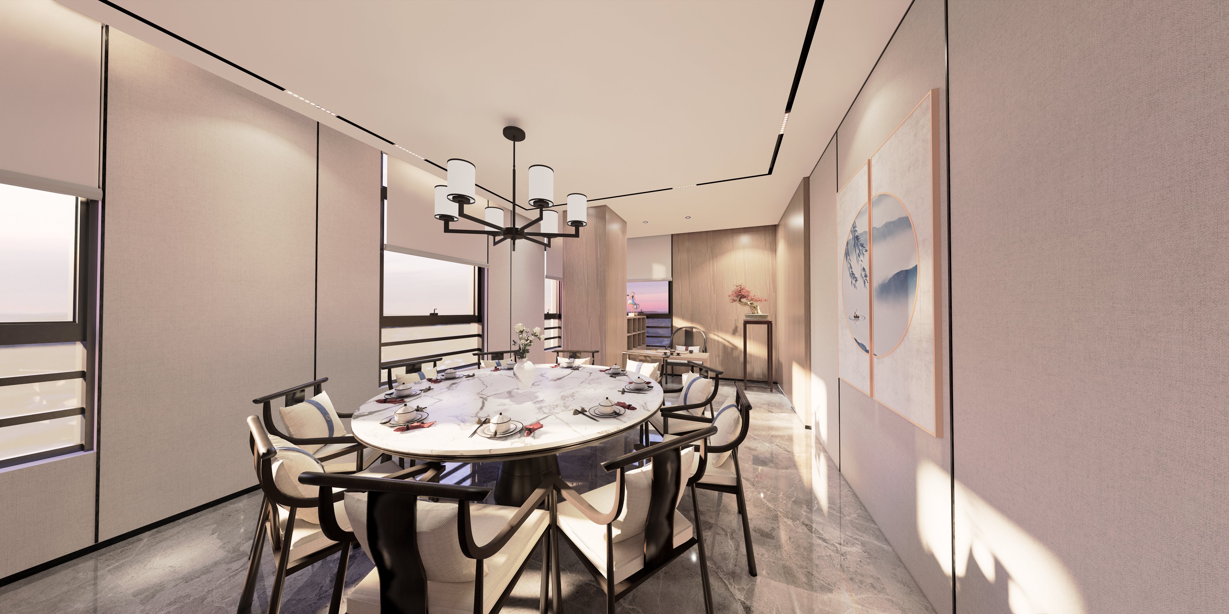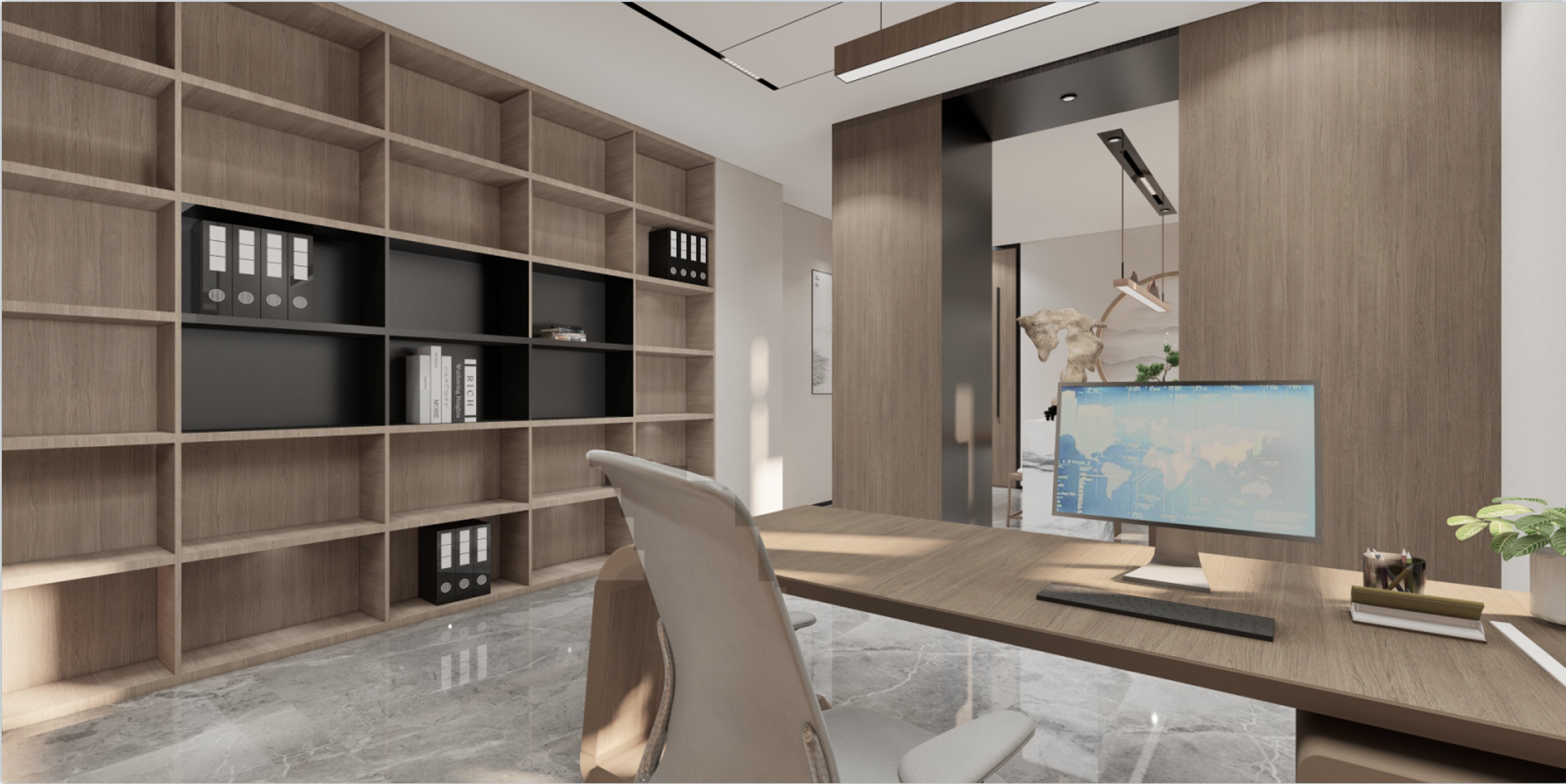 以现代的设计手法和材质进行升级呈现,入口处大理石形象墙,同木纹的前台区域营造出素雅的质感空间,在设计和规划上更关注场景营造和纵深感,赋予此区域更大的想象空间,既保持了沉稳、大气的理智感,又不使气氛过于肃静。大理石纹路的高颜值成就了空间的轻奢有度,实木的饱和质感刷新了工作的仪式感,一室容纳古今变化,有传承才能有创新。 整个前厅区域,用材质划分空间,把前台与其他空间区分开来。半高通透的风水盘伫立玄关一隅,仅设一窄桌一摆件,迎来送往,静默不语,又起着隐形隔断作用,呈现出一种通透感,创造出艺术且合理的多重渐变。 公共茶室,摒弃华丽的装饰,以书画和藏品展现业主的文化气质。 每一处视角都各有姿态,每一个断面都凸显出创意的氛围感。随处可见的现代感装饰艺术,不论哪个角度入镜,都颇有意趣。