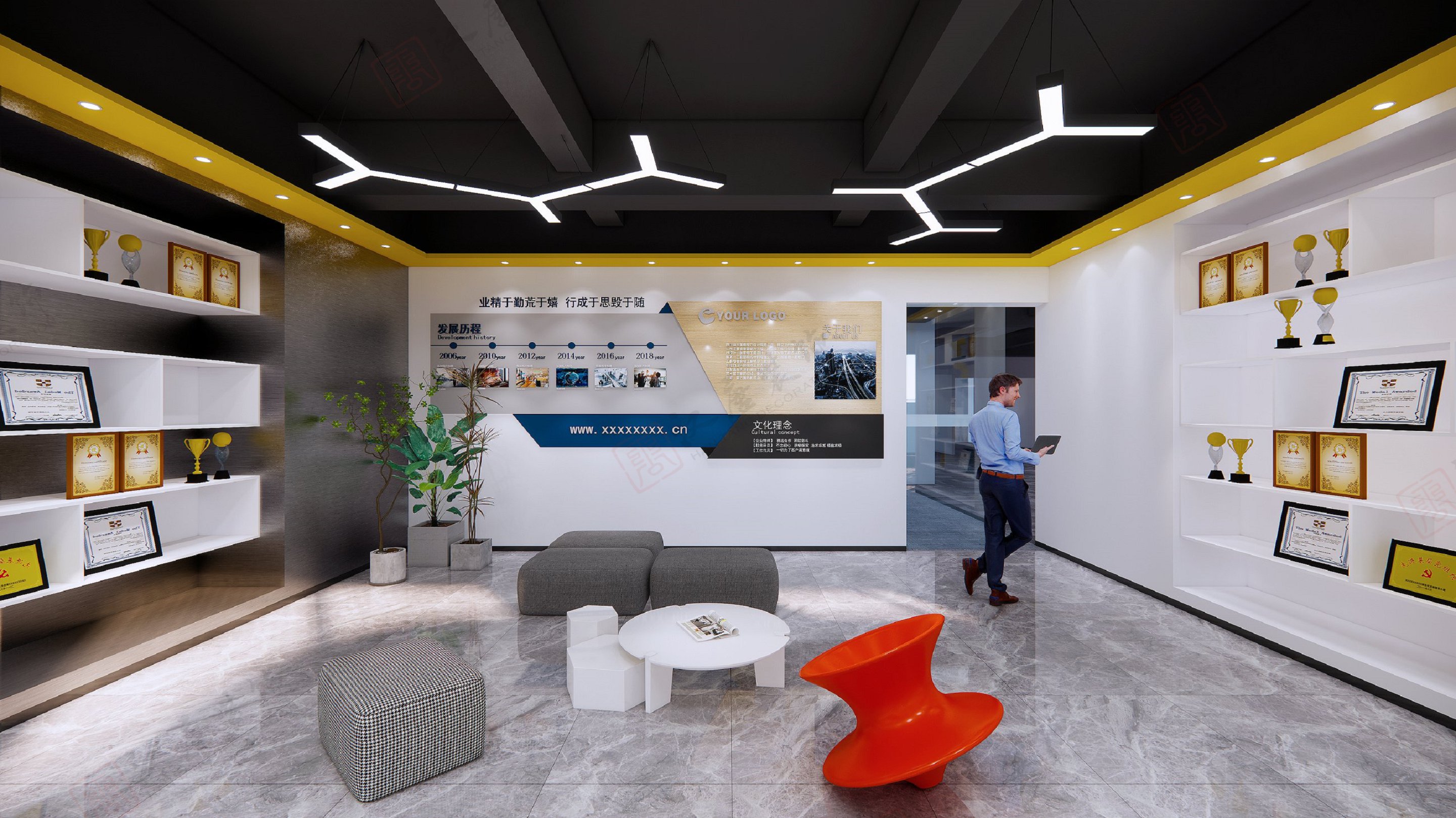背景墙用金属拉丝护墙板,吊顶采用金属网,整体风格科技感比较强。 当人们进入空间后会产生怎样的情绪感知,往往是设计师探索与思考的核心。接待形象墙是最重要的识别记忆,所面对的群体,除了员工,更重要的是提升客户与供应链等人群的记忆点。 荣誉展厅去繁就简、点到为止,使装饰充满趣味。基于空间的比例与尺度以错位的隔板设计展示墙,横条灯带的设置,在墙体与灯光的映衬下十分醒目且质感十足。 与前厅色调相呼应,品牌展示区同样以白色铺底,金属饰面板点缀,吊顶采用裸顶喷深灰色,拉高视觉高点,加上艺术吊灯的点缀,使空间得到很好的延伸。 高效、舒适是作为办公空间设计所需要塑造的环境艺术,在温暖而舒适的环境中办公,并体验空间极致的艺术魅力,作为设计的本质追求。对空间进行分割组合,走过走廊,两侧都为办公区域,但空间开合有序,显现灵动。大量采用暖调破除办公冰冷的氛围,缔造温暖而舒适的办公环境,让员工在办公瞬间享受瞬间。 天花吊顶采用裸顶喷灰,让整体空间感更高,柱子采用仿真青苔绿植做装饰,局部通道用明黄色做点缀,让整体空间气氛活泼融洽,更具活力。 会议室秉承现代简约的设计宗旨,合理分区,沉静讲究,传达着清新的质感与内涵,这同样也是品牌调性的空间体现。 总经理室四周的视野开阔,为办公提供了一个舒适雅致的环境。大大增强人在空间无意识的情感互动,在与空间对话的瞬间便可激发灵感。