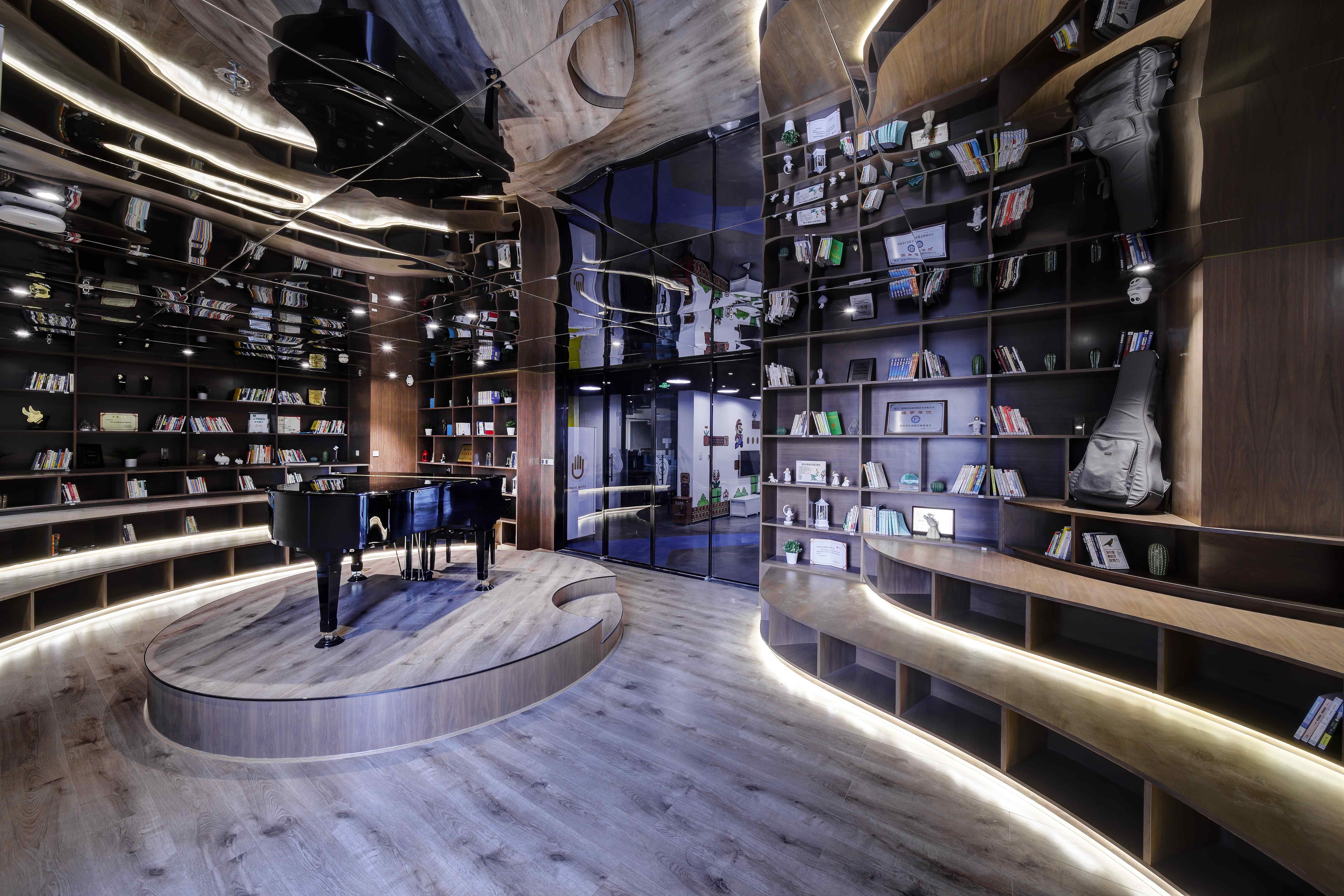 其实,工作和生活是密不可分、互相依存的,从来都不能割裂脱离。因此,开放式办公区域设计,打破传统隔断空间,更便于交流沟通。高效的交流环境、办公空间,永远传达人、事、物的和谐之美。沙发、格栅板、渐变色系地毯构成了点、线、面三维的完美融合,构造了超现实主义的视觉感。