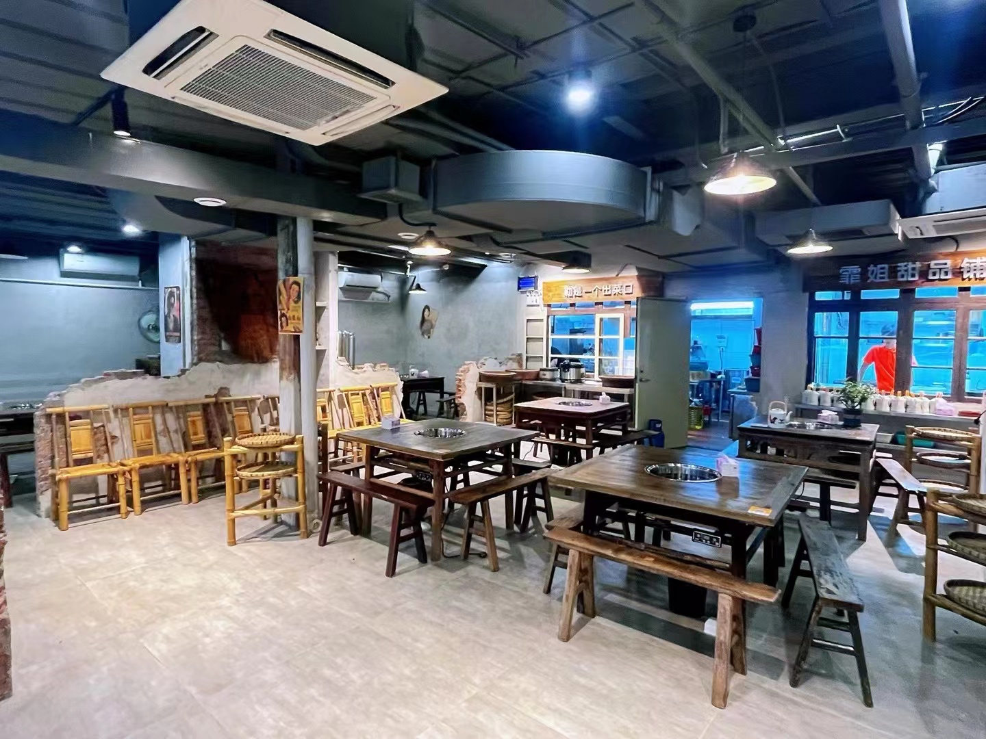 大厅由矮墙分割区域,在那里我们费了很多心思与时间,需要建好墙体,然后重复的砸墙修整造型。刮去部分水泥层。墙面预备贴旧海报画,展示柜放置年代感的老物件,让客户怀旧的情怀一下怦然而起。
