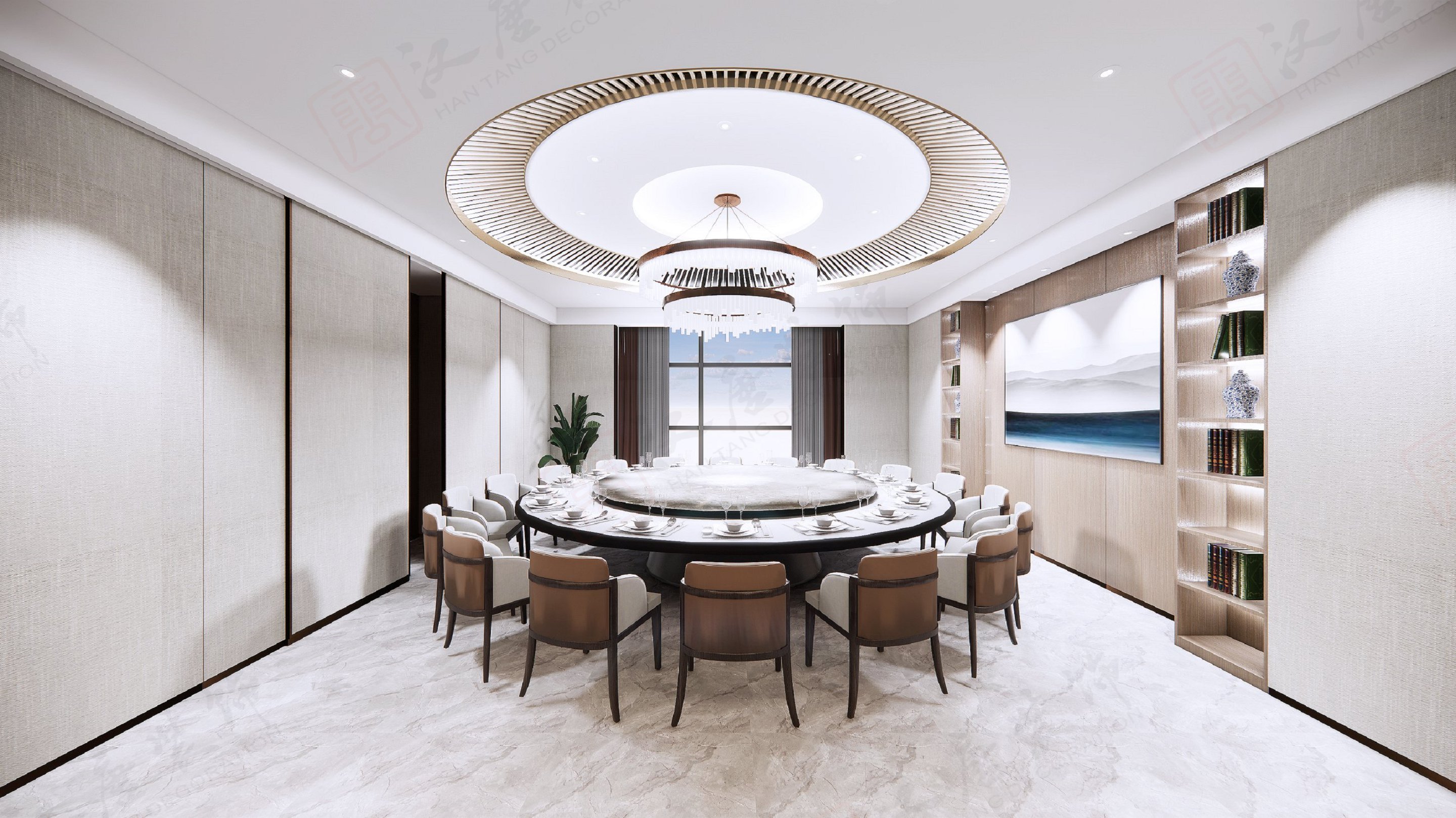 整体色调采用暖色布艺硬包及木纹色护墙板,吊顶采用了软膜灯箱模拟天空自然光,让空间明亮柔和,圆餐桌吊顶采用圆顶呼应,拉高了层高,让吊顶层次更丰富,整体风格偏新中式风格。