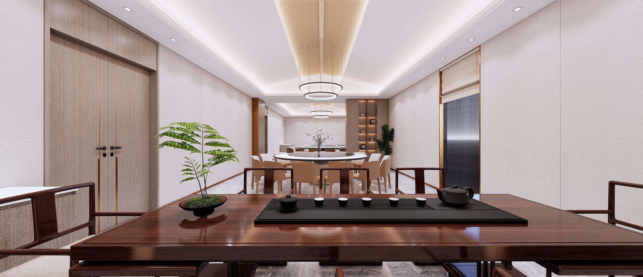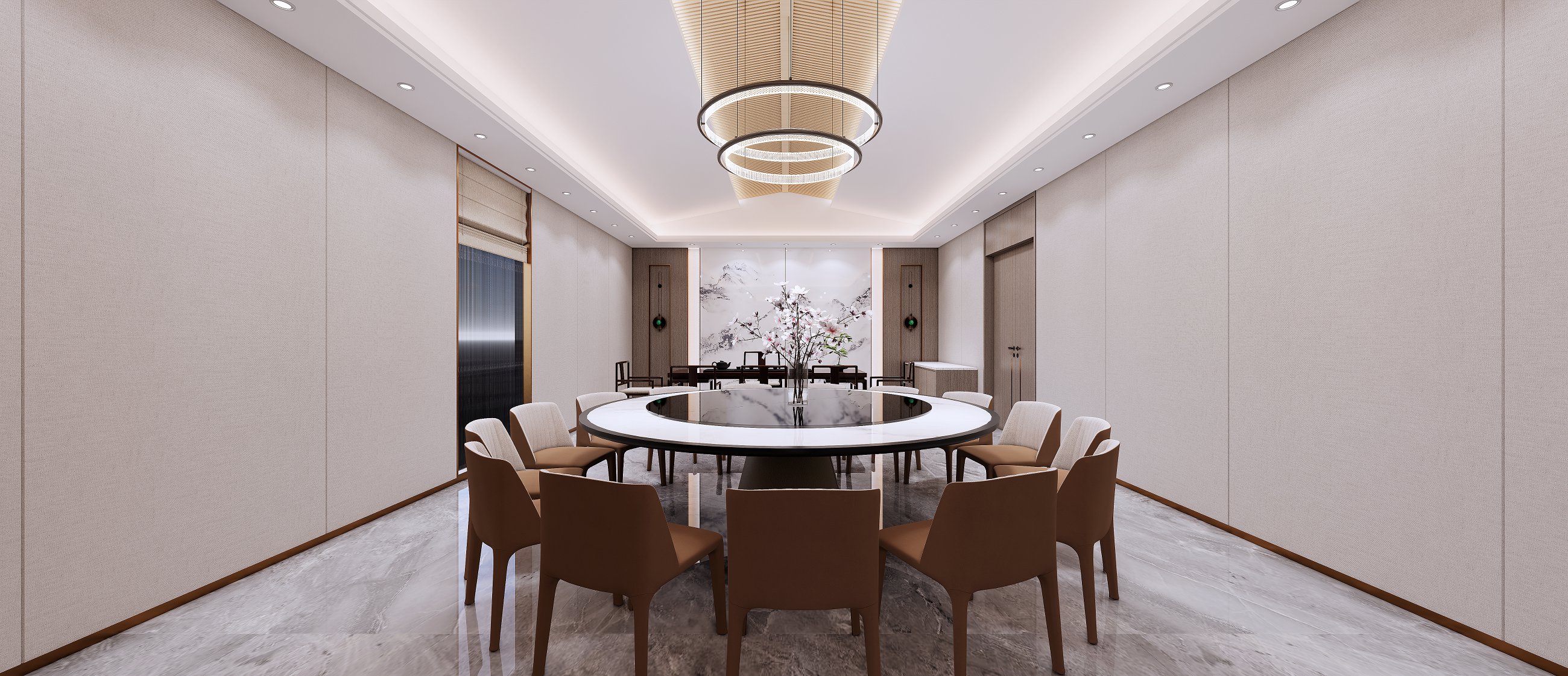 目前设计功能2个包厢,包厢中间会有移动隔断门,可以合并成一个大包厢,包厢设计在比较隐蔽的区域,靠近大门区域的是员工就餐区。