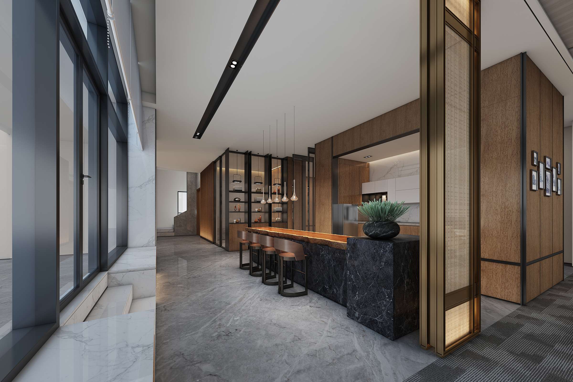 整个空间以深色为主色调搭配木纹、原木和简单的线条,加上陈设的点缀。让整个空间舒适自然又不失生机。营造出幽雅,休闲的舒适空间。