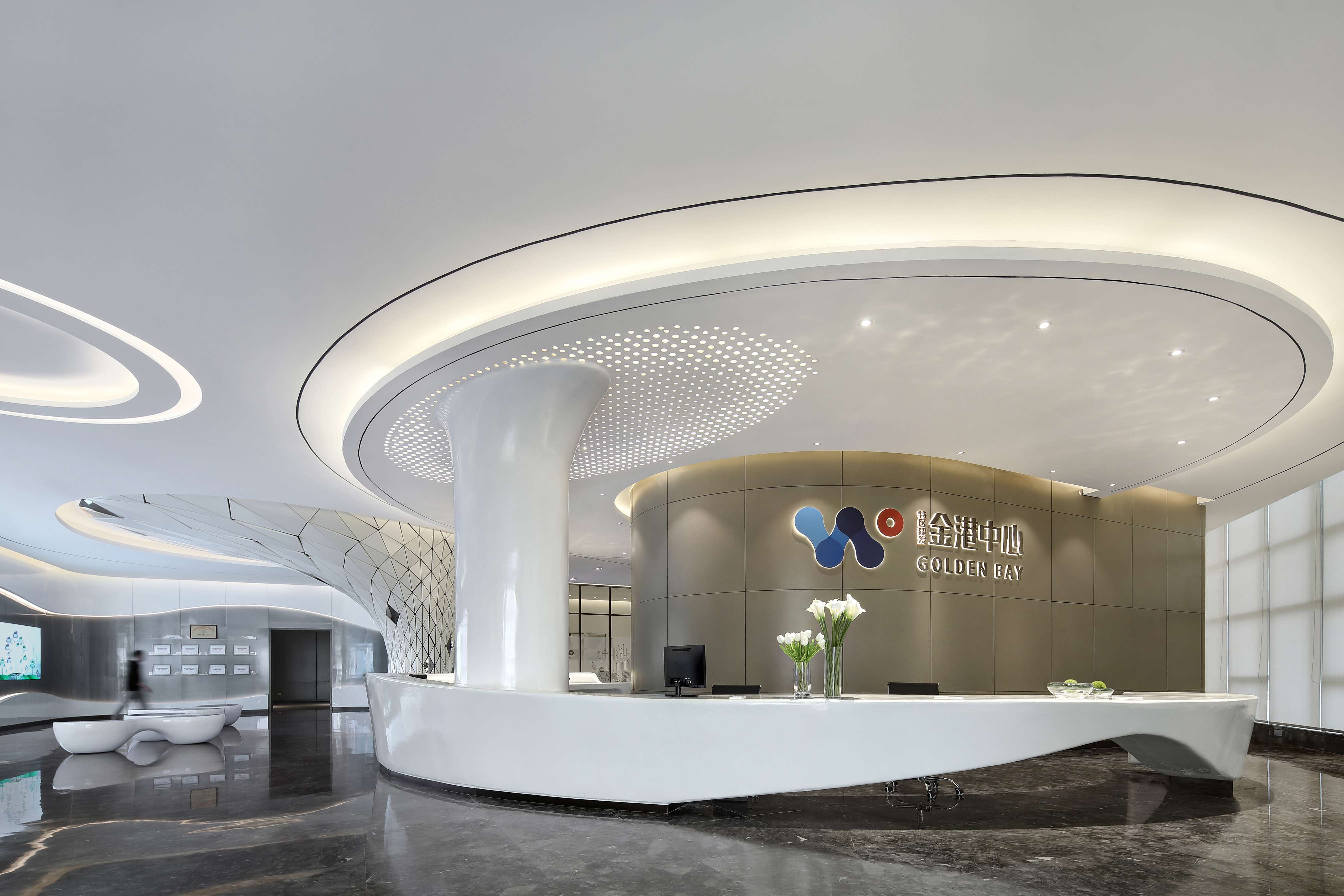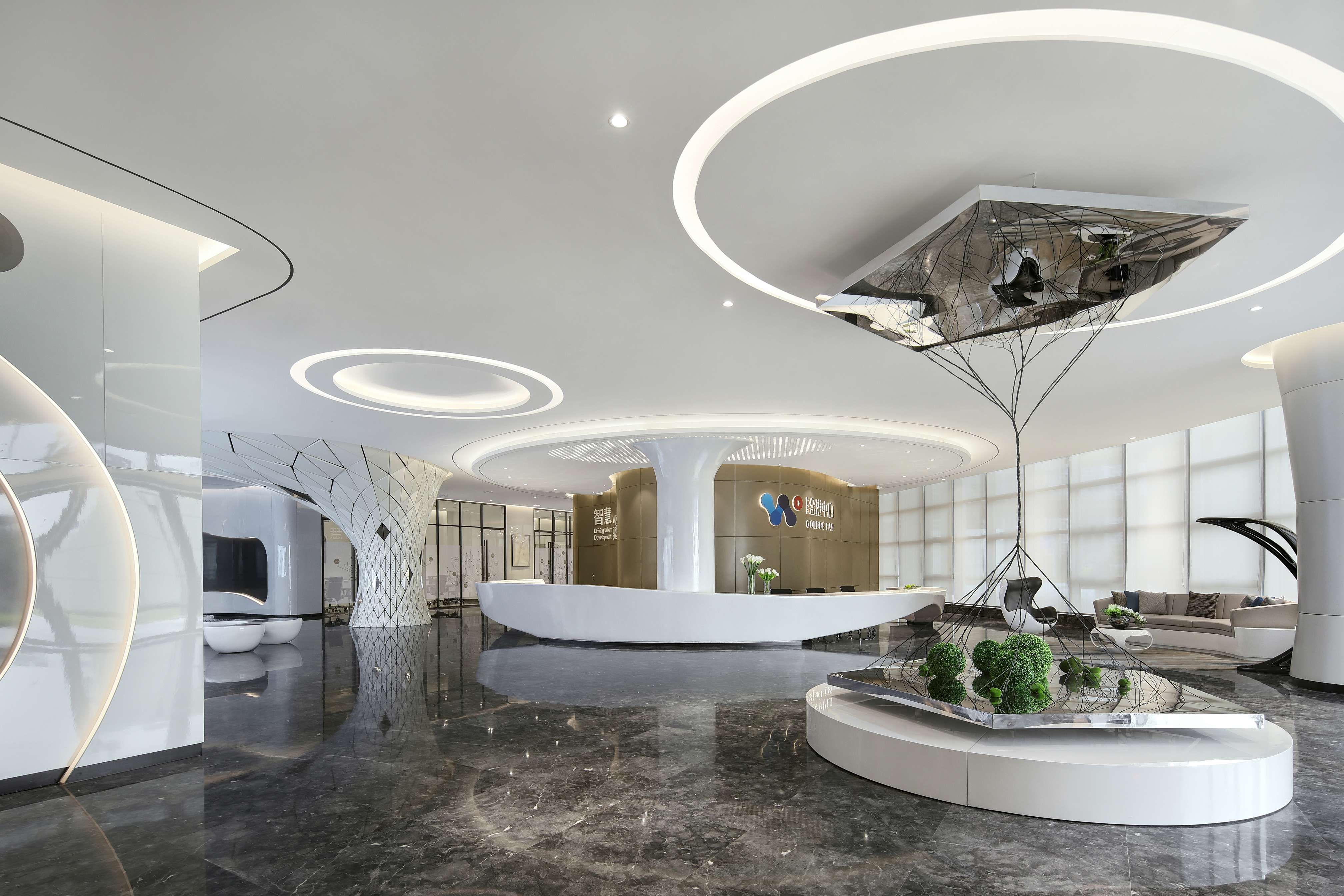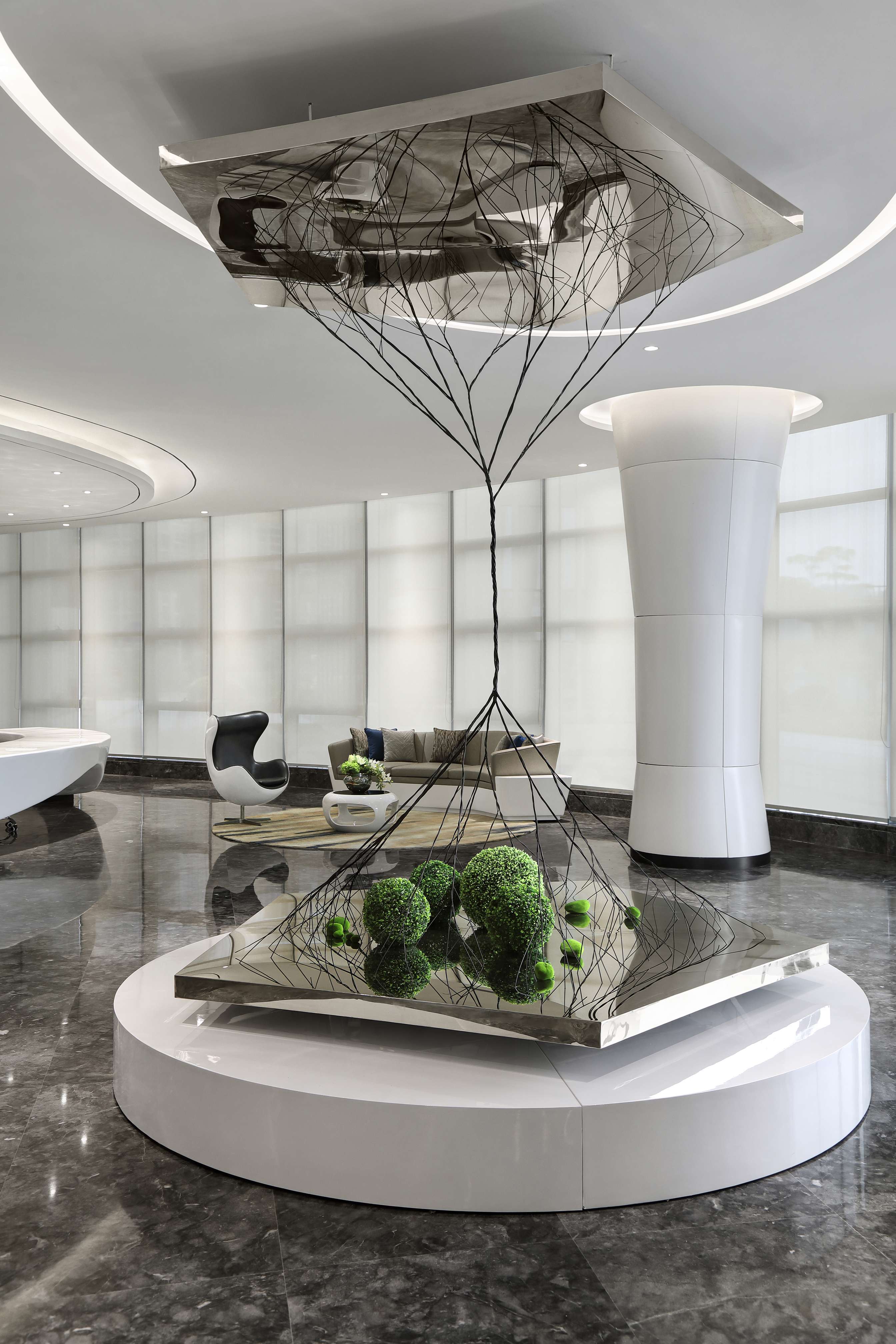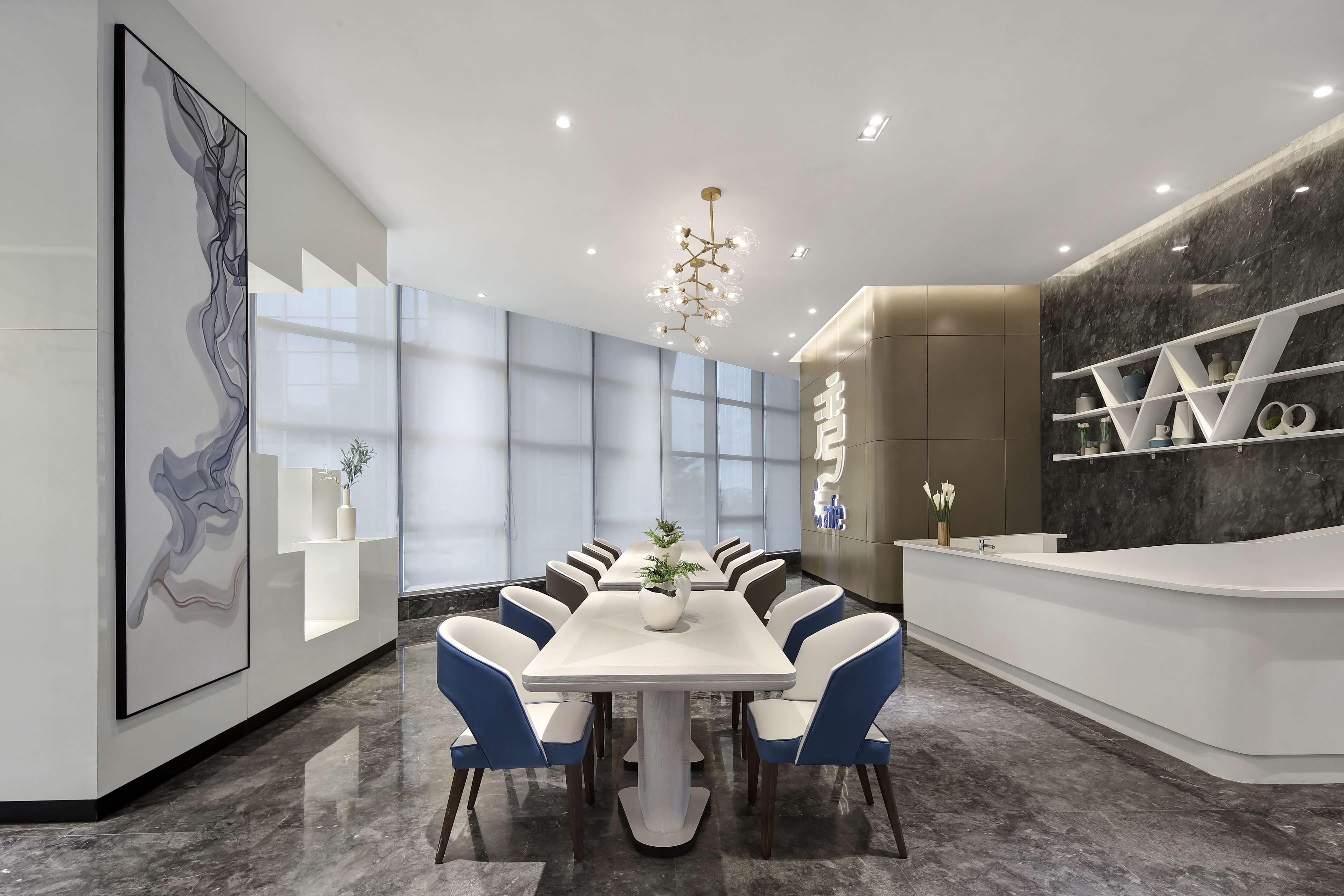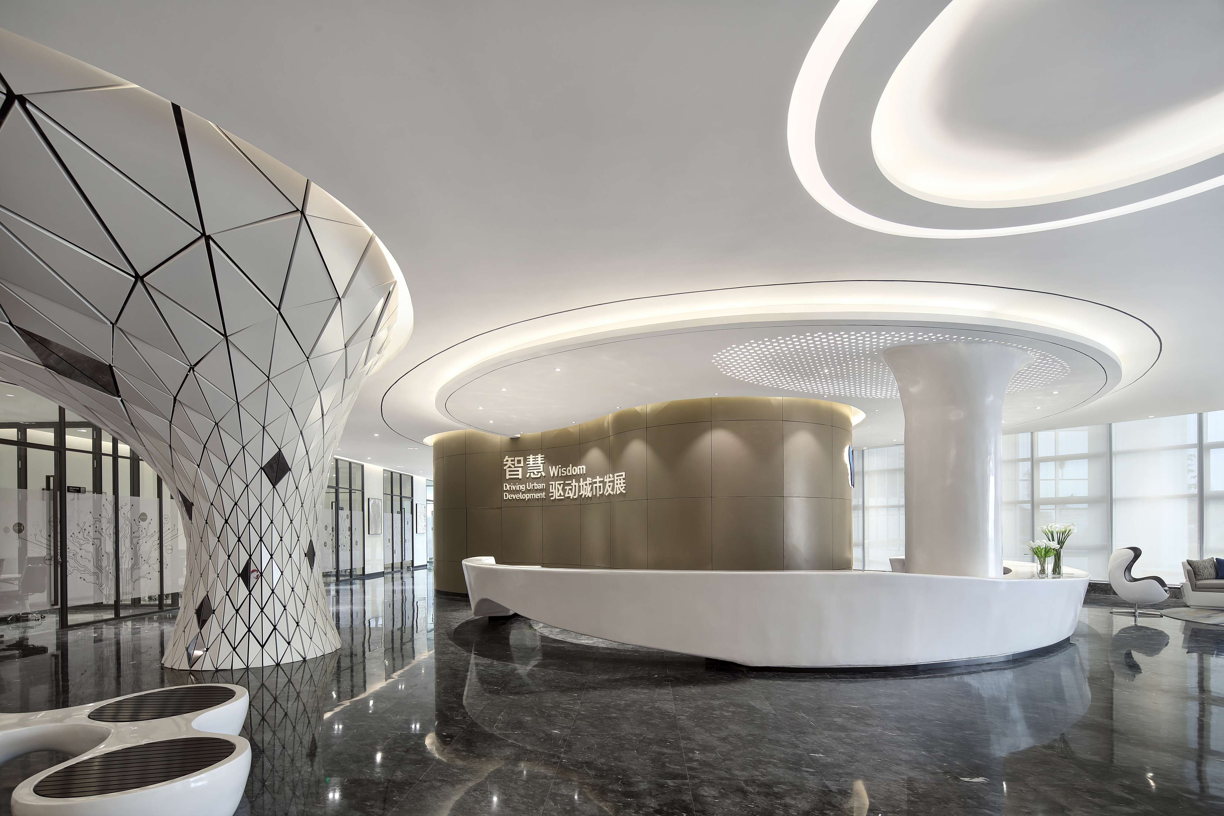 整体设计风格以浅色调为主,装饰手法庄重而不呆板、简约而不简单、中庸而不庸俗。通过对建筑幕墙的横竖向线条进行演化,并运用到室内装饰上,贯穿到不同的功能区域,自然而然地将建筑和室内空间联系在一起。从建筑的造型上提炼特征,形成建筑与室内的联系,并做演化将建筑、艺术、环保有机结合,由重复产生的韵律感和统一性,也是生成空间隐重大气的重要设计手法。开阔且开放的空间满足了面对面的交流,带来了唯有对面交流才能达到的效率和彼此信任,也促成了有效率的工作。